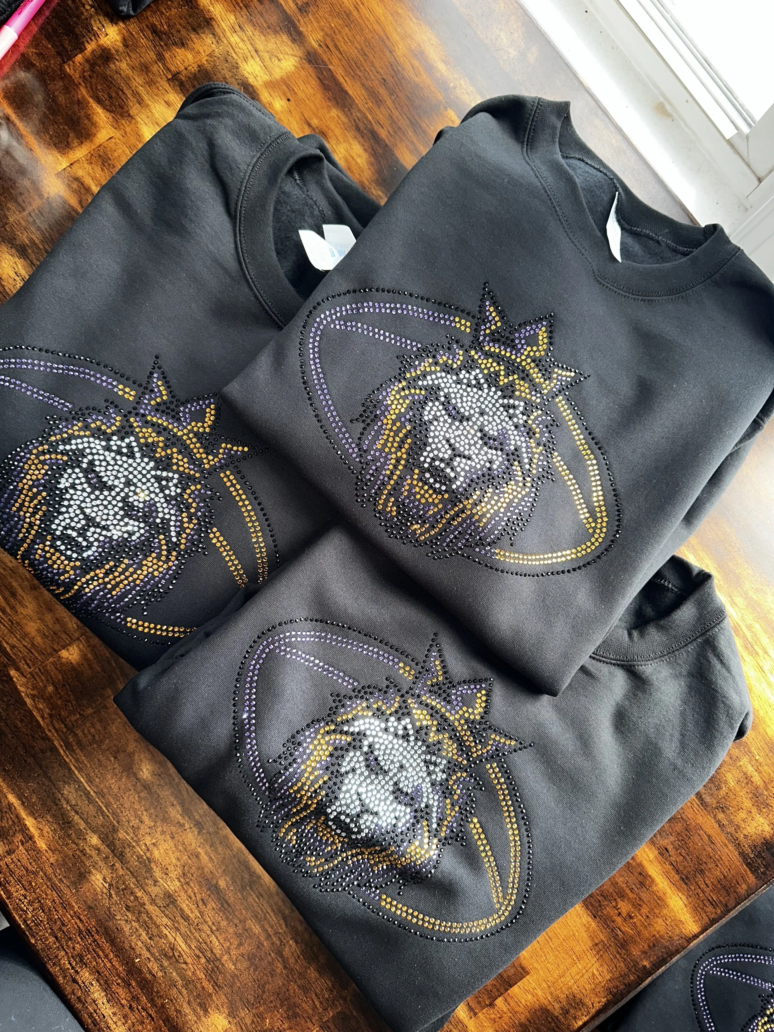 Now offering Custom Rhinestone Transfers for purchase or we can apply them as well! Either send us your design you’d like digitized into rhinestone art or we can provide custom artwork for added fee*